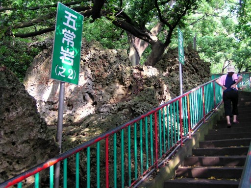 一個右彎即到達鼎鼎大名的清水寺,又稱清水巖。循車道續往前繞至廟左後,出現早起人潮,有明顯階梯往山上。清水巖附近有很多奇形怪狀的岩石,都有命名。一開始的陡上步道旁是五常岩,乃是珊瑚礁石灰岩,與壽山半屏山所見者同。H19m |