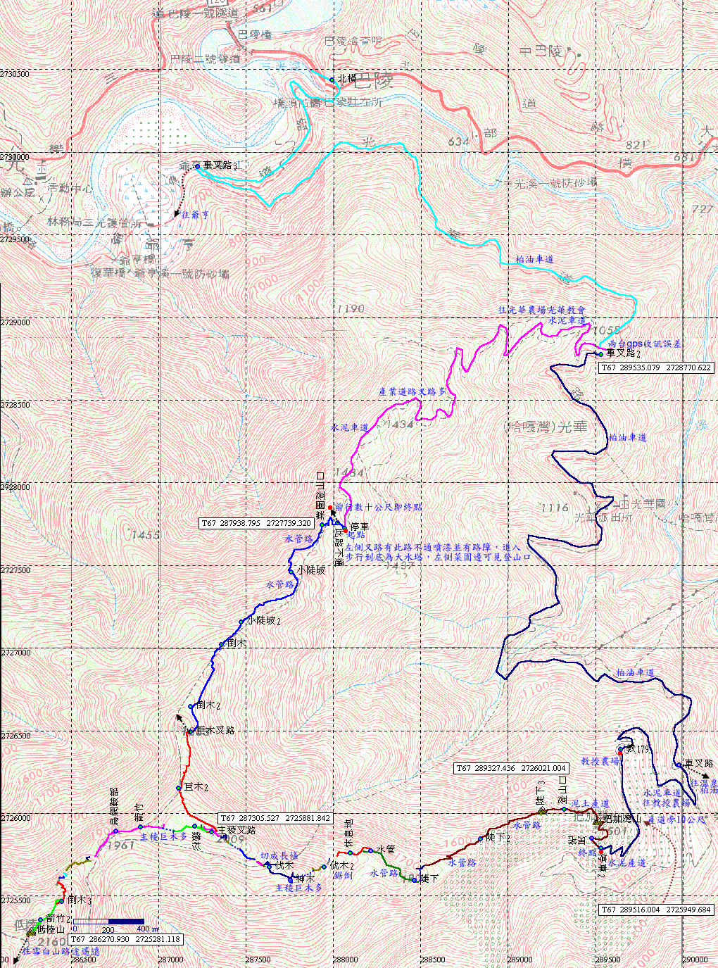 續行,兵分兩路,駕駛辛苦些,原路回菜園登山口。直行,往新興部落,路跡有點凌亂,跟緊路條。 |