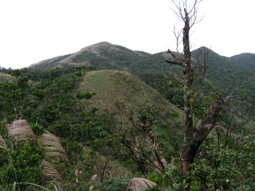 叉路,左右兩線會合,路口被擋,顯然右路才是正道。此處展望佳,眺望窖寮山,果然有一方之霸的氣勢,座下有四個芒草小山頭,像小鬼頭。眺望三方向山。H720m |