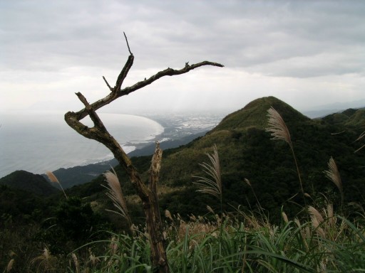 出發,不再循雪山主稜,取左循海邊支稜陡下,芒草徑又陡又滑,還好長度不到100公尺。俯瞰頭城農場。 |