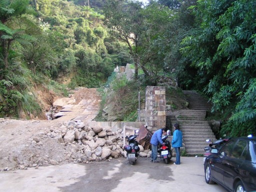 泰安瀑布入口,正大興土木,小溪流慘遭蹂躪。入口處有寬大步道通往泰安瀑布。但右側另有一較小步道,有登山路條。取之。陡上。H139m |
