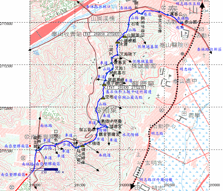 步道叉路。指標說明,來路往明志書院1.3km,右路往南亞塑膠廠(林口)450m。左路沒有說明,應可下往泰山巖。這裡也有隻鴿子,姿態迥異。取右。隨即再遇步道叉路,直行循稜。稜線步道輕鬆好走,也有不錯的瞭望點。H210m |