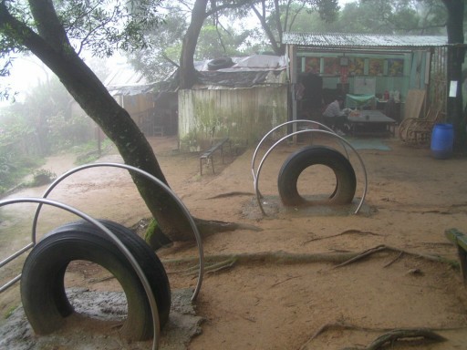 新加坡。在涼棚裡面有標示牌。此處以前來過,展望不錯,可惜今天滿山雲霧,什麼都看不到。循稜往前的路被地主封鎖,否則通往大尖山二尖山最快。如果大尖二尖五尖之外,還有三尖四尖的話,這裡勉強可稱四尖,而此處與二尖之間的小山頭,則是三尖。涼棚內有張路線圖,有標示五尖山,沒標高,我登頂的應該是正港的五尖山沒錯。H295m |