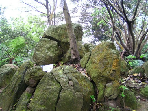 繞回先前初見鐵絲網之處。這裡的鐵絲網有個缺口,朝裡面仔細瞧,哈哈,發現一顆基石,就在旁邊約3公尺處的小土丘上,進入登頂。 |