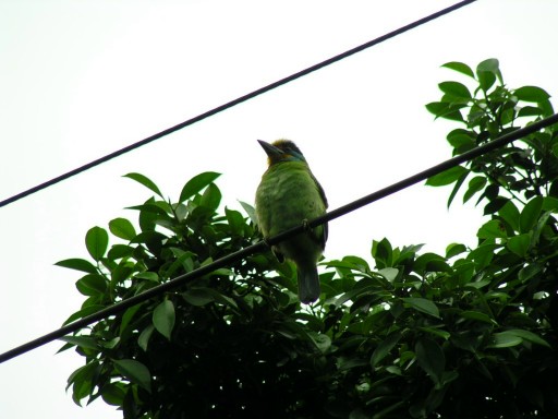 遇見三隻乖乖停在電線上的五色鳥,可能連下太多天雨,牠們慵懶地呆著,鳥都不鳥我們這群人類。 |