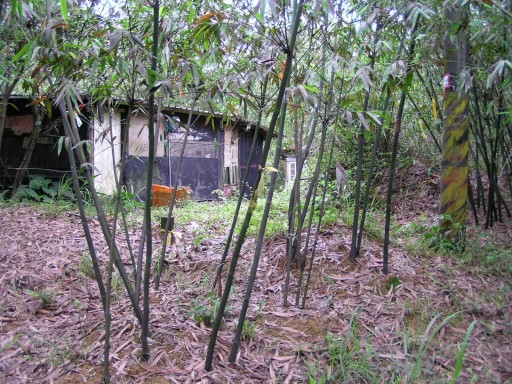 左轉進入,開始在附近找可疑山路,尋找通往山谷溪澗中的古壘。有一條明顯小徑通至菜園,循稜仍有山路往上,最後終止於倒塌的木屋。稜線左側與溪谷接近垂直落差,約30-40公尺,遍尋不著下切之路。 |