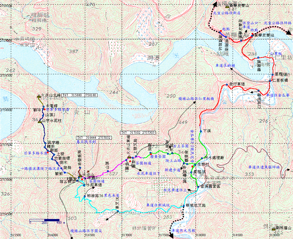 搭新店客運至坪林灣潭路站,原本應該在黃櫸皮寮站下車,但我不小心提早一站下車。雖然不小心,但此處卻有更好的展望,可以預覽火炎山區,尤其那座無名的金字塔峰,真是好看。俯瞰北勢溪,這裡的灣潭之名,就如下游碧潭附近那個灣潭一樣。出發,往坪林方向前進。H225m |