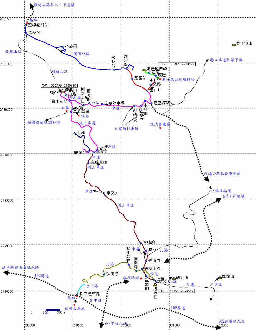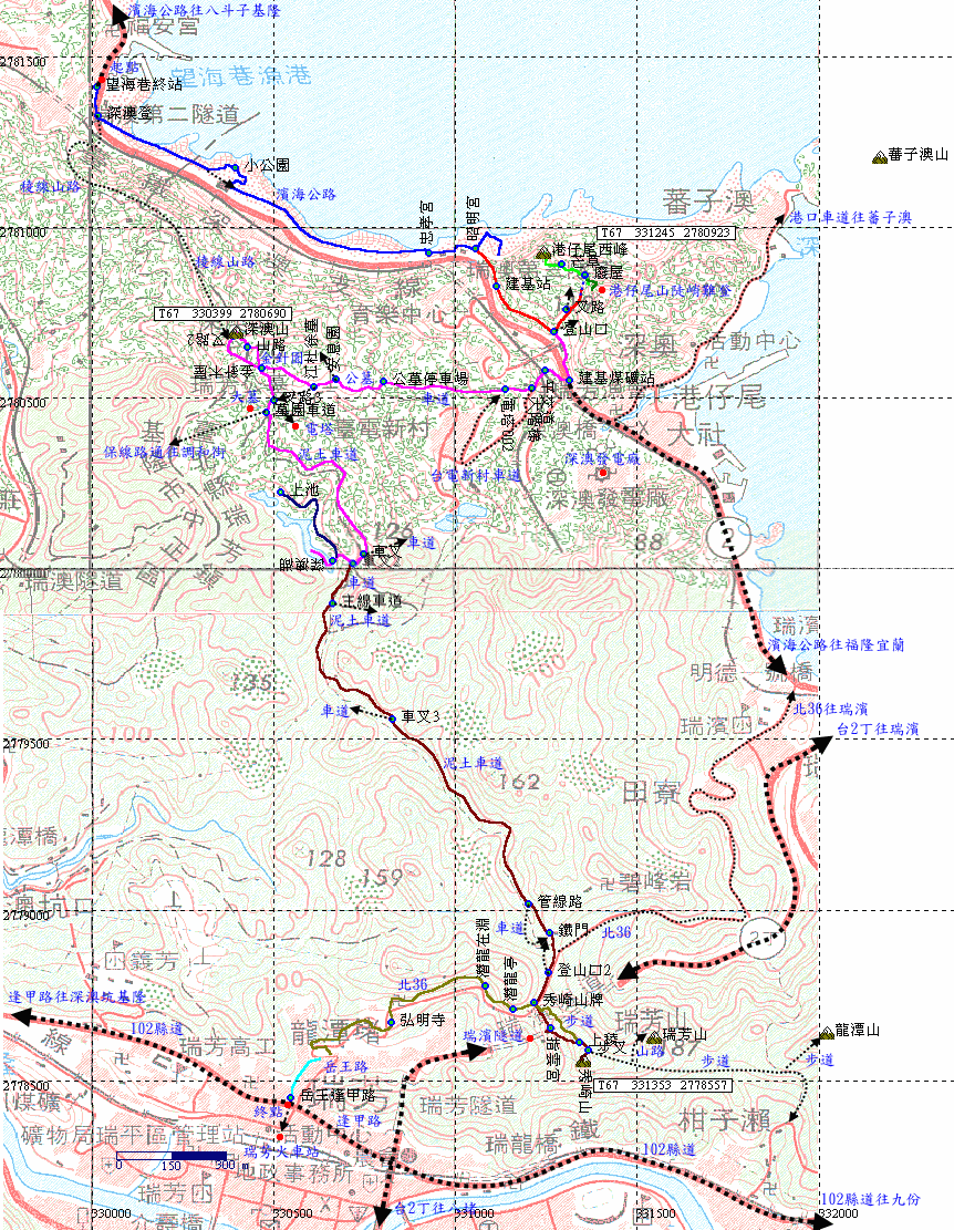 車道入口鐵門,原來管線路不過是捷徑一條。鐵門人可通行。先出到水泥車道,再接上北36鄉道,左往瑞濱,右往瑞芳。取右。旁邊有登山指標往深澳山。H126m |