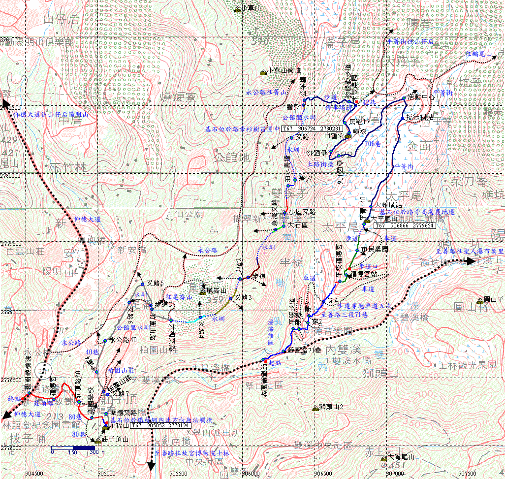 平菁街106巷底。巷底有小土路往上。這裡有不少楓樹苗,顏色鮮豔。H366m |