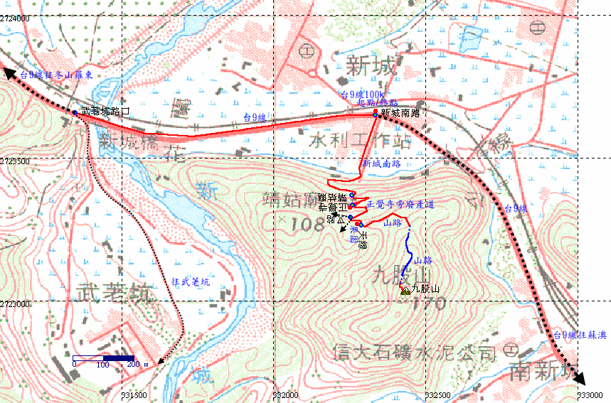 騎車沿著台9線往南,經過冬山,武荖坑路口,至100k處,右轉入新城南路,一路上行,經過靖姑廟,到達路底的正覺寺,廟右側有廢棄產道續往上。H71m |