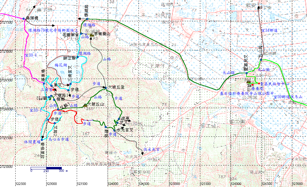 梅花湖,頗大,風景優美,山腰上有大廟,三清宮。取左繞湖半圈,左轉上山,遇叉路應取左往三清宮,但是我們取右,繼續上行,在大停車場接上宜33-1鄉道,取左繼續往上。H41m |
