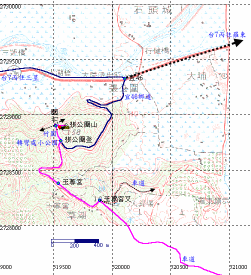 下抵宜33-1,入口有鐵門封鎖。鐵門旁的電線桿上有三角點噴漆,這條應該是登頂的最短路徑。休息,等小花,結果他也在香格里拉等我。誤會冰釋後續行,循宜33-1下山,鼻頭橋十字路口左轉,改循宜46,一路跟玉尊宮指標。H160m |