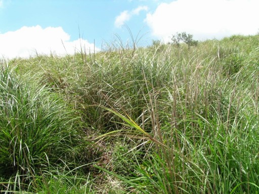 稜線杉木林,轉往稜左牛路。登頂前出現短芒草叢草地,往高處走。H684m |