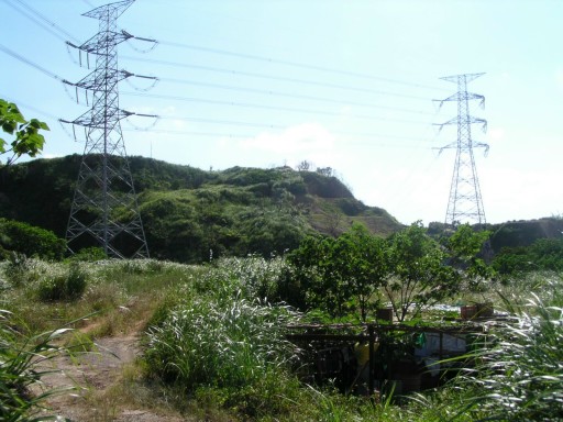 電塔016位於建築工地陡坡山腰,難以接近,左轉循急陡的鬆滑土坡直上登頂,後段轉入芒草叢。 |