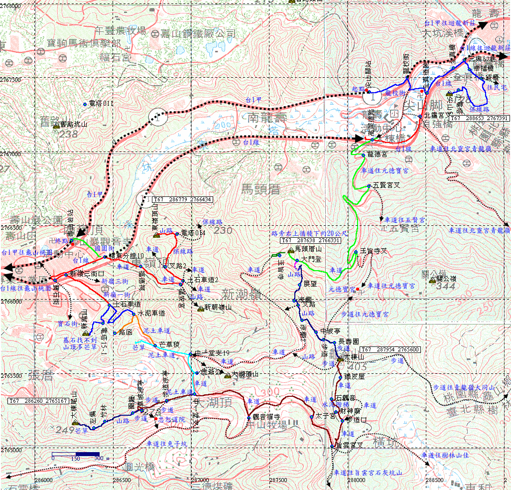 回到產道主線,連續叉路,左往樹林山佳。取右,再分岔,左往鶯歌,可登石灰坑山,有旨雲宮指標;右往龜山,可登大棟尾山大湖頂山。再取右。H320m |