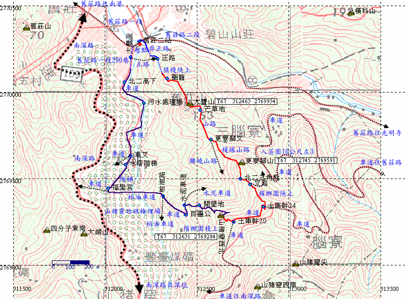 接上九重宮附近的產業道路,左往舊莊街,右往南深路。休息。土庫幹22一枝24電線桿。H235m |