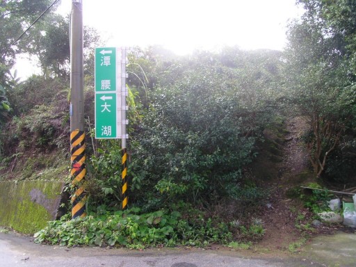 左行約30公尺,有潭腰大湖指標,其右側有明顯農路入茶園,進入。稜線茶園路徑清楚好走,但無登山路條。展望極佳,眺望雷公埤山稜線。稍後入樹林,稜線山路路況極佳。H418m |