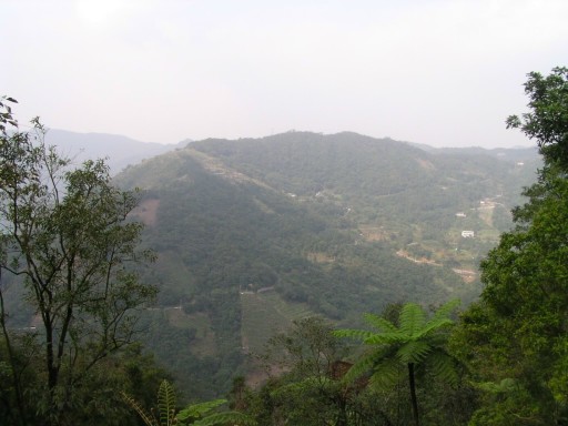 茶園中叉路,發現一路條,取左上茶園高點搜尋,無發現,下方正是雲海國小校門口,退回續行主線往上。遠眺雷公埤山。遠眺翡翠水庫,不過角度甚至比不上風露嘴與十三股之間的北宜公路上。H541m |