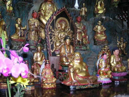 善法寺,位於台9省道與台7丙省道交會處附近,北成路上,廟前有座白色大觀音像,石佛就在廟前右側樹下,第十二番,正法寺,千手觀世音,全身漆金,還有小燈泡裝飾。此廟的金爐很特別,有南亞風味。午餐就在這附近的牛肉麵店解決,餐後循台7丙省道往三星,三星之省道轉折處左轉,經過市場,循成功路往山區,過水源橋。H21m |