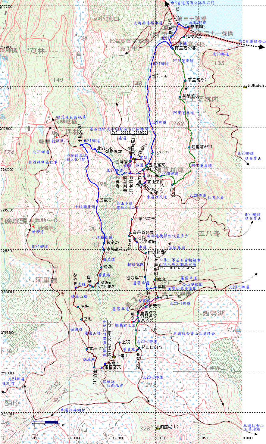 回到北21鄉道,坪林高幹120電線桿,右往小坑,左往草埔尾,取左。H155m |
