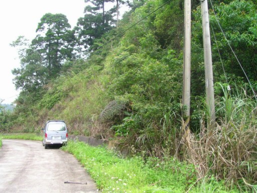 回到登山口。上車,續行產道,結果終止於料角坑35號民宅,而無法通到泰平村。回程在產道上發現很多魚腥草,同學要拔回去孝敬老媽。摘後續行北42。眺望料角坑山灣潭山。H484m |