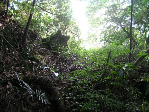 山路往右下切,繞過稜上巨岩,再回稜線上。H409m |
