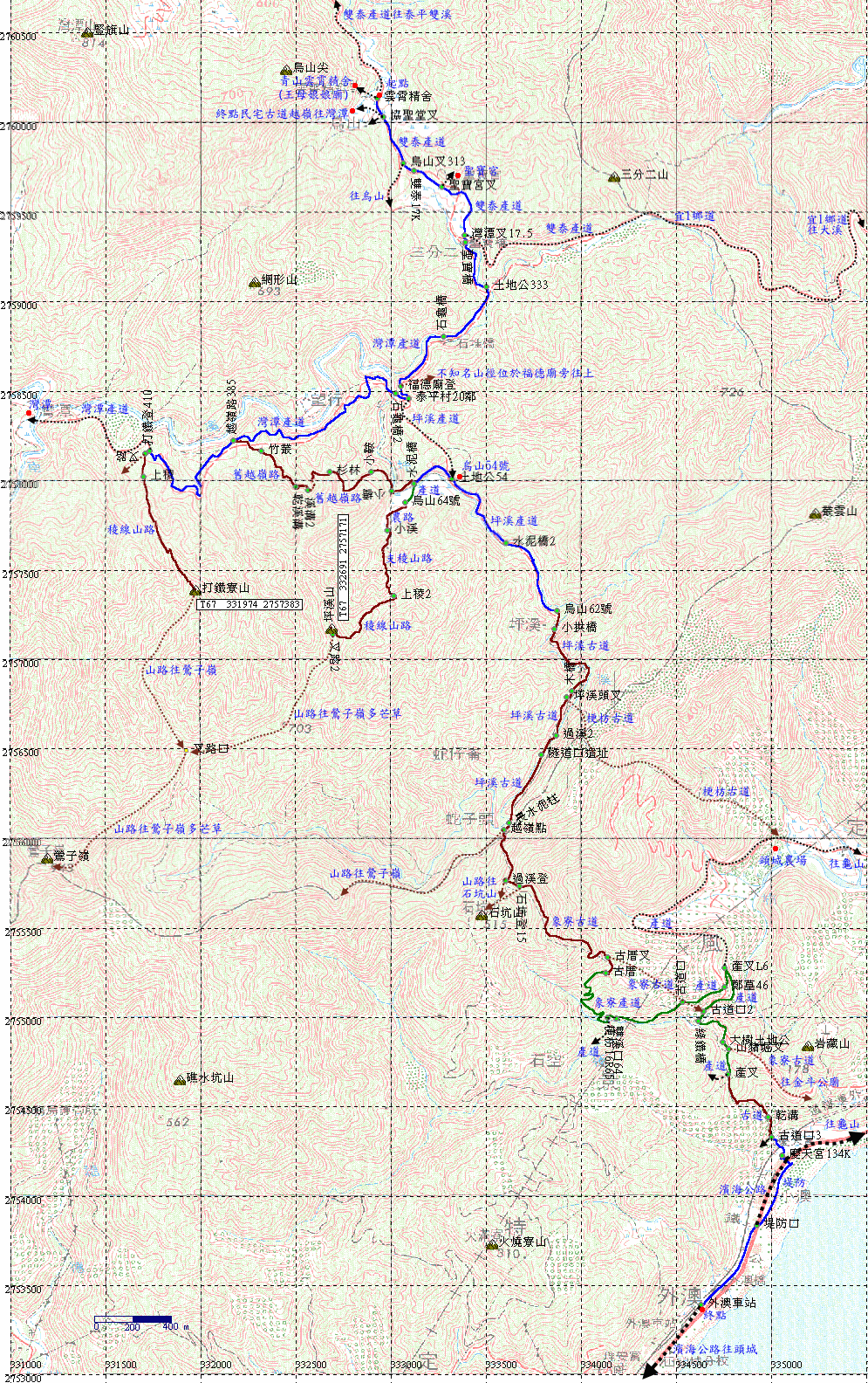 車道叉路,約在雙泰公路17.5K處,雙泰公路左彎往大溪,右路往下通灣潭,入口雖有指標,但不夠明確,所以地面上滿滿的都是噴漆,有點難看。取右。隨即通過聖寶橋,剛才的雙泰公路旁有座聖寶宮,兩者應該是有關係。H465m |