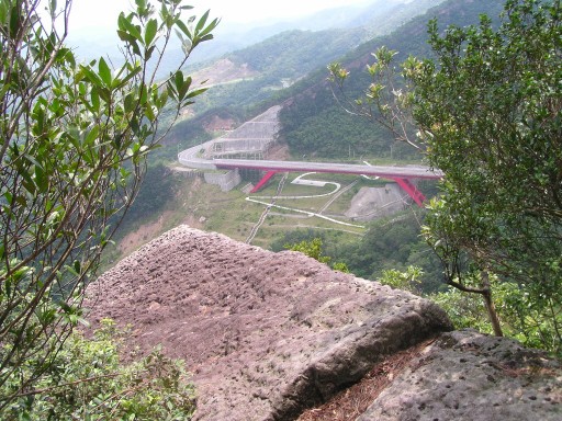 大斜岩懸崖,往下伸展,這裡是觀賞汐萬路彩虹橋的絕佳之地,涼風習習,休息。眺望汐萬路彩虹橋,遠眺叭嗹港大尖,眺望柯子林山,眺望五指山。H338m |