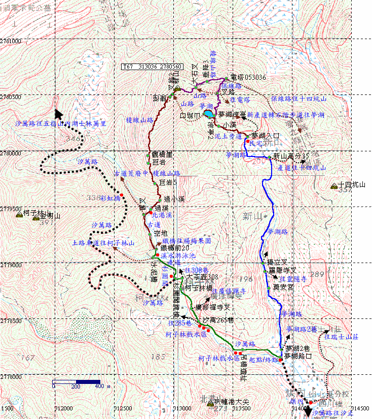 車道叉路,新山高分35電線桿,左往新山夢湖,右往十四坑山,取左,夢湖土雞城就在這裡。H190m |