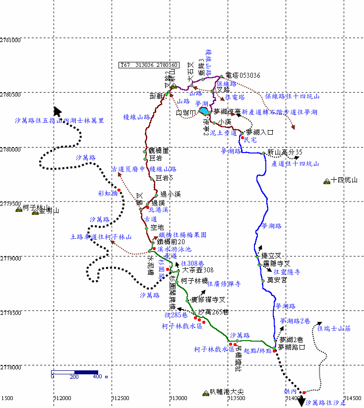 水泥橋,過橋後叉路,左往汐萬路;右往民宅,再循小路上汐萬路,可登柯子林山。取左。H99m |