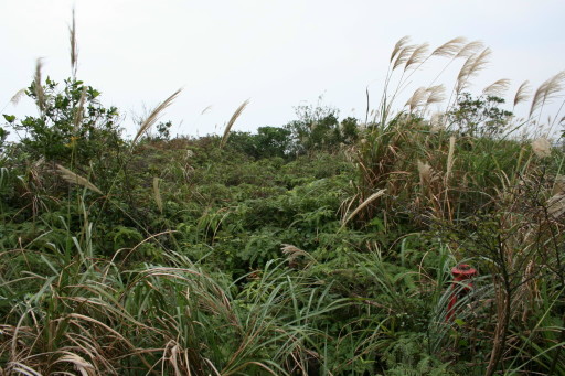 皇天不負苦心人,終於讓我發現基石,土地調查局圖根點,果然是位於靠近基隆港這邊的平台邊緣。如果從紅色管線筏開始走的話,與基石距離約25公尺,首先直直穿越芒萁區約15公尺,遇數棵小樹右轉,迂迴繞至平台邊緣約10公尺,即是基石所在。原本想續探球子山燈塔,無明顯路徑,且怕太靠近軍營地界,還是算了,保持距離以策安全。 |