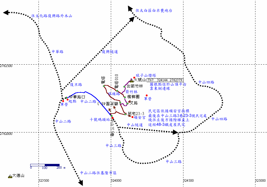 中山三路3巷23之3號民宅,右後側叉路,右往順安宮,約十幾公尺而已。取左,階梯直上,通往民宅,遠方可見電塔。H25m |