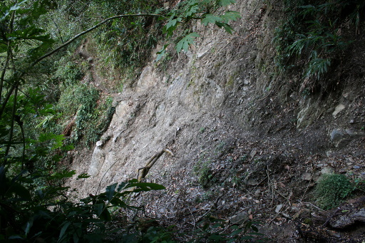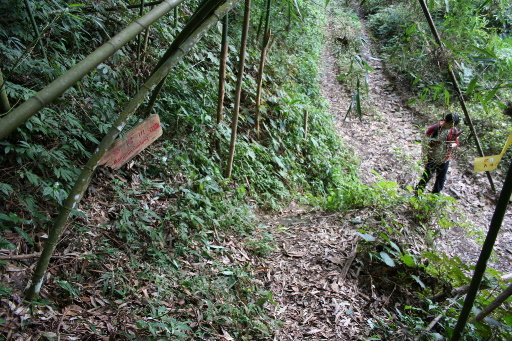 山路突然往右下稜,路條終止,路跡不明,顯然此線已久無人行,最後決定回頭再找其他登山口。 |
