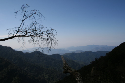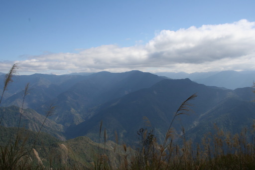 上稜處有顆大石,展望非常棒,可以預覽棚機山。棚機山在此處眺望,氣勢非凡。遠眺東方,可見五六七八九溪山,很有趣的山名,照號碼排,但不是很好區分誰是誰。遠眺東北方,可見龐大高聳的玉山山塊。遠眺北方的脈脈山。這裡可見獵徑越嶺而下,應該可通往楠梓仙溪流域。續行,稍退回稜線下方的正路。 |