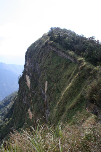 崩塌地,須橫切約10公尺,土石鬆軟,踏足點狹小,小心通過。不小心滑落則幸好只深約10公尺,不會太危險,但要爬上來也不容易。過後出現芒草地,路跡明顯,展望極佳,可遠眺曾文水庫。H1982m |