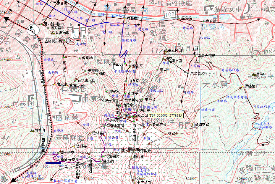 步道叉路,左往南榮路,右往寶明寺。寶明寺是紅淡山區最古的寺廟,循步道可回紅淡山,取左。H40m |