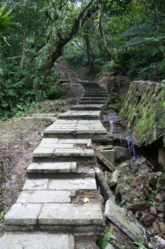 步道叉路,左下為更寮步道支線,應可銜接荖寮古道,直行為更寮步道,直行。石階步道循溪上行。末段轉陡。H267m |