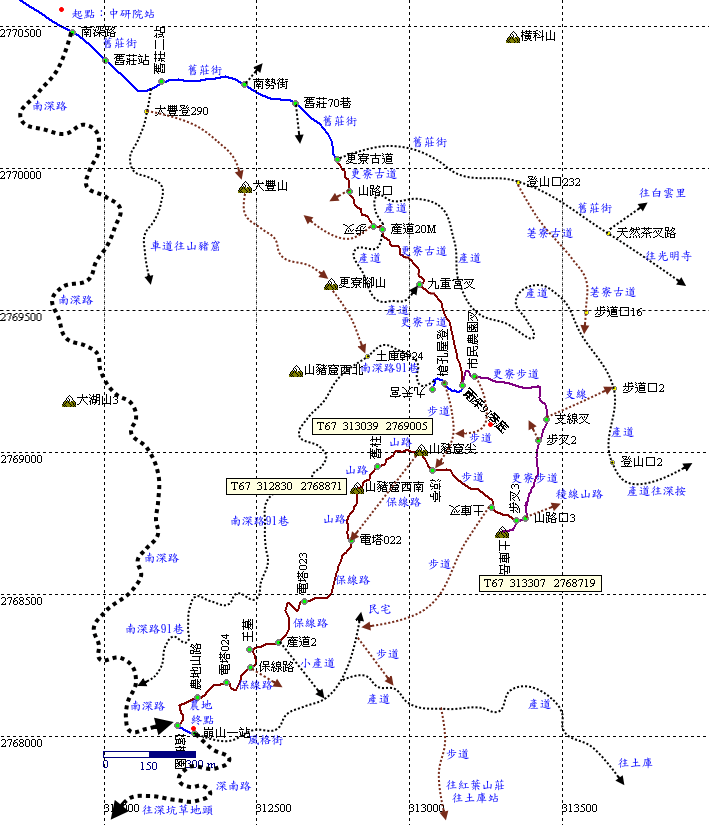 更寮古道入口,位於舊莊街二段122巷口,指標與路線圖齊全,從124號民宅右側進入,隨即出現石階步道往上。一會兒在電線桿上發現登山指標,往土庫岳順古道上,往大豐山順古道上二分右下。不久果然發現右側有往下的山路,有一路條,路況不佳。續行步道。俯瞰北宜高南港隧道。H47m |