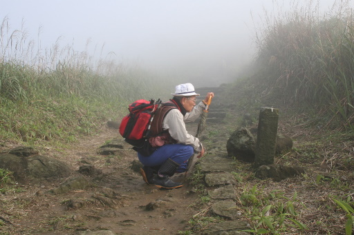 基隆山,588m,台灣小百岳007,三等三角點一一○九號,基石位於山頂天線圍牆旁。山頂開闊,有涼亭與休息設施。展望本是絕佳,可惜雲霧籠罩,僅能依稀眺望東峰石尪山。通往東峰的山路都是芒草稜線,但入口頗明顯,我看到前輩先去綁上了路條,稍後聽說等一下要去東峰巡視。前輩在涼亭裡面幫基隆山寫上新的山頂標示牌。H584m |