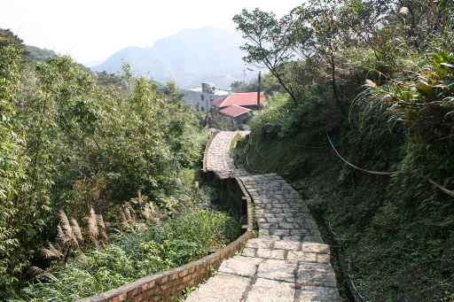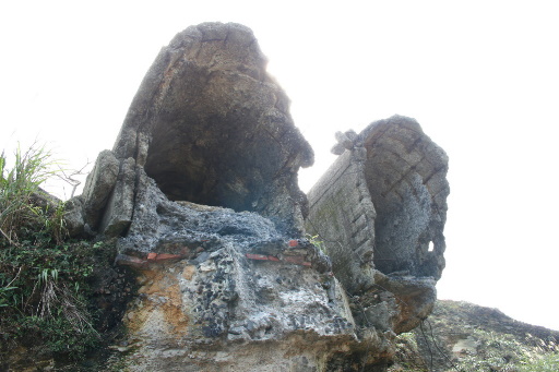 崩塌,產道路基流失,但已有山路取代。這裡眺望石尪山,氣勢非凡。繞過崩塌區後,即見大型的廢煙道,從道路上方通過。這裡往下可俯瞰黃金瀑布。可以把黃金瀑布與石尪山、基隆山合於一景,不錯。H167m |