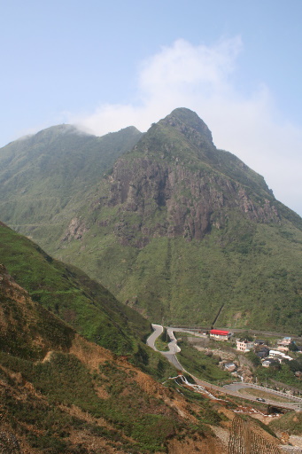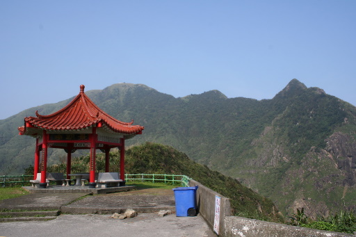 景明亭,位於車道大轉彎處,展望極佳,眺望基隆山及其東峰石尪山,俯瞰蜿蜒如蛇的金水公路及神奇的陰陽海。涼亭旁有座小山,跨越欄杆有明顯小徑循稜登頂,往探,末段路況不佳。H257m |