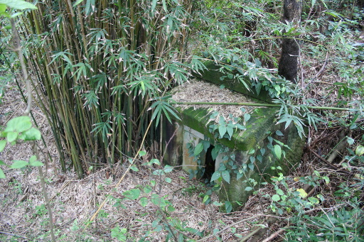 竹叢,發現一座石砌的小廟,應該是有應公。這座小廟可能有數十年都沒人來過了,四周根本毫無路徑。續行仍是舉步維艱,灌木叢中有大片的有刺菝契,我的大小腿因此傷痕累累。前方出現一座雄偉的山峰。H61m |