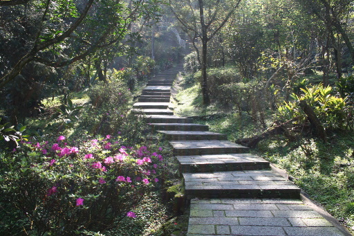 早安橋,開始一路往上的寬大步道,步道沿途的櫻花已差不多都謝了,而杜鵑花正蓄勢待發。H74m |
