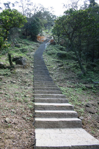 接回勤進路,稍往右走幾步即是天秀宮。入口左側關著一隻山豬,續行的步道口也在左側,嶄新的花崗石步道,繞至廟旁,稍後即上稜,此後就一路陡上。展望極佳,俯瞰汐止地區。中途有短暫平緩,然後繼續陡上。H239m |