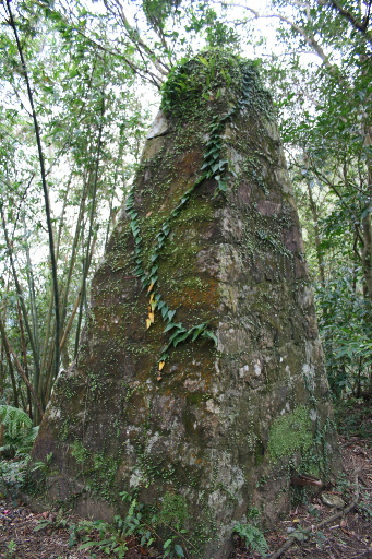 奇特的石塔兩座,高約三四公尺,位於陡下完畢後的小高地,據說是早年流籠的基座。續行立刻遇廢棄竹園小鞍部,叉路,無說明,左下應可通往作埤內古道,興建石塔之人應該是從這條路上來的。直行。稍後山路持續腰繞,路基偶有駁坎,有點像是古道的樣子。但後來開始陡上小山頭,就不太像了。H530m |