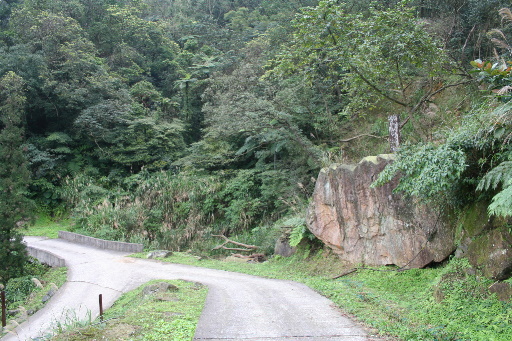 磐石嶺鞍部,汐平公路在此越嶺而過,山路入口處有磐石古道指標,往四分尾山210分。此處往保長坑溪谷方向有一條新開闢出來的古道,據說可通往作埤內,或出仁愛橋,原本打算走這條路下山,下雨作罷。磐石嶺假日有免費的汐止社巴可搭下山,但今天非假日。H539m |