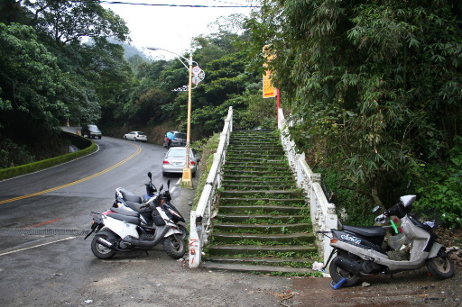 登山步道口,位於福南宮過後約40公尺路右,寬大而老舊的石階,配上夾縫中長出的青草,非常古典。往觀音寺約500M,往竟南宮約1200M,往烘爐地約1900M。免費接駁公車來了,裡面擠滿了沙丁魚,幸好我不在裡面。步道一路往上略陡,細雨中仍有不少遊客撐傘而行。稍後轉為水泥步道,仍然非常寬敞。步道不時與車道貼近或穿越。H47m |