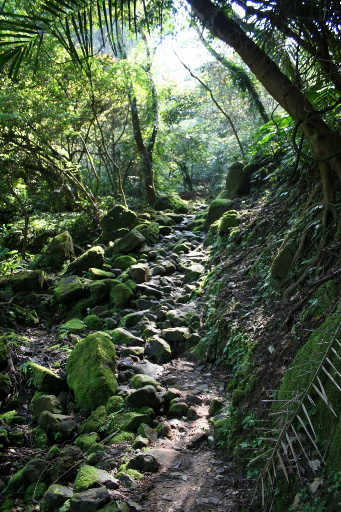 續行,古道轉陡,出現石階,但路況仍舊不錯。末段出現攀繩陡上,但還不難行。 |