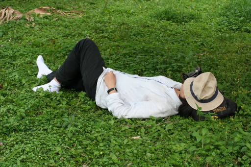古道上口,位於車道大圓環旁草皮內,並不十分顯眼。大貝分線32電線桿,上面有古道噴漆。休息。車道左往逸光幼稚園,右往石管局。草地實在太舒適了,悠閒地躺著休息。H243m |
