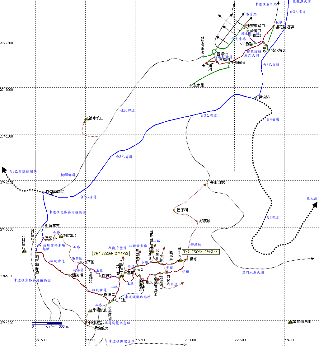 北二高龍潭交流道,學姊開車,左轉往石門水庫方向,左轉中正路,此後一路循台3乙省道,10K處左轉往崑崙藥用植物園,粗坑窯指標叉路口取左側較小車道。 |